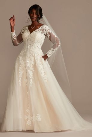 David's Bridal Collection Sheer Lace And Tulle Ball Gown Wedding Dress in Ivory/Champagne Size: 26W David's Bridal