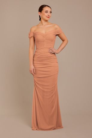 Celebrate DB Studio Mesh Off-The-Shoulder Ruched Dress in Terracotta Size: 4 David's Bridal